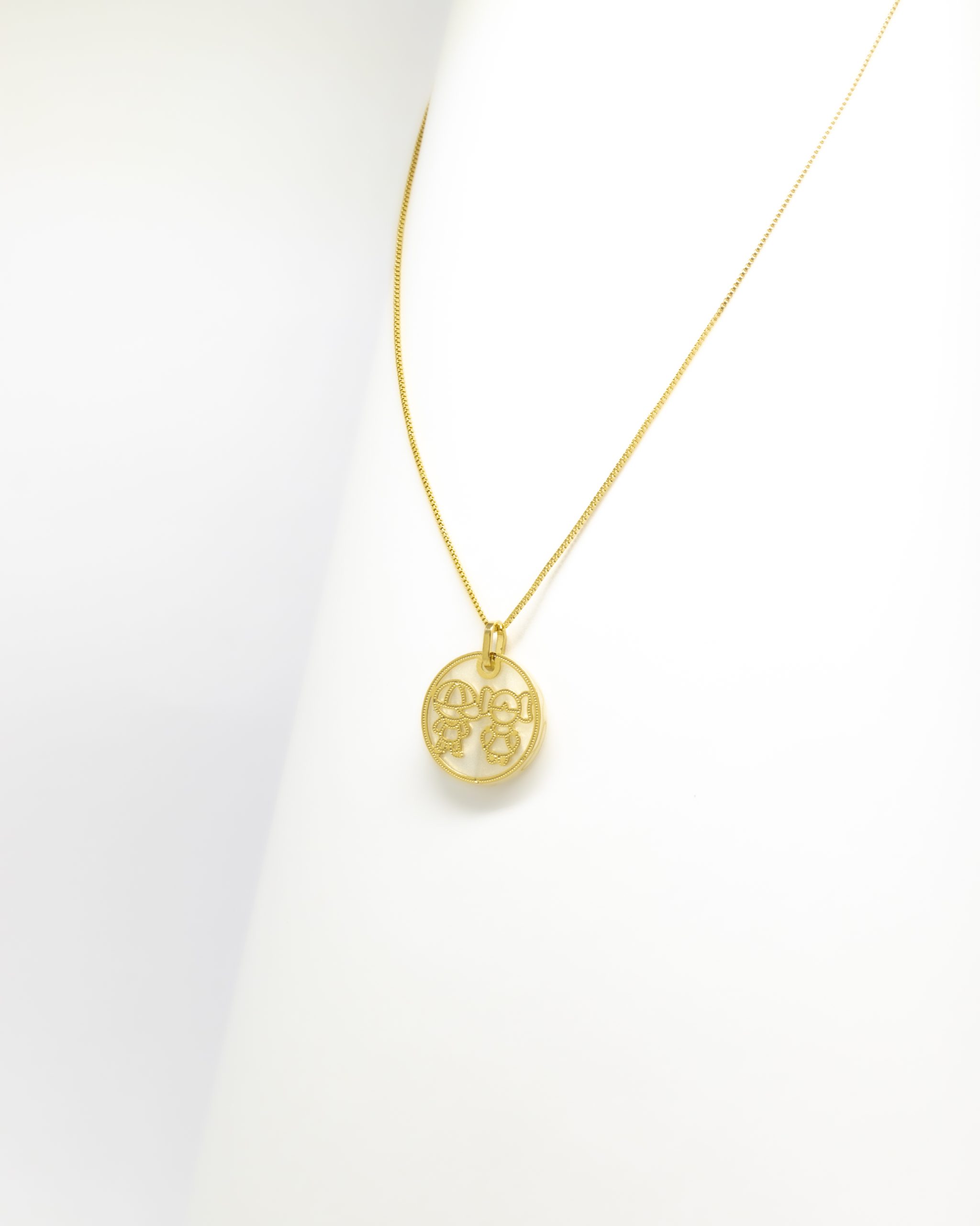 Gargantilha com corrente veneziana de 45cm e medalha de madrepérola com vazado de menino e menina. Um símbolo de amor e união familiar!